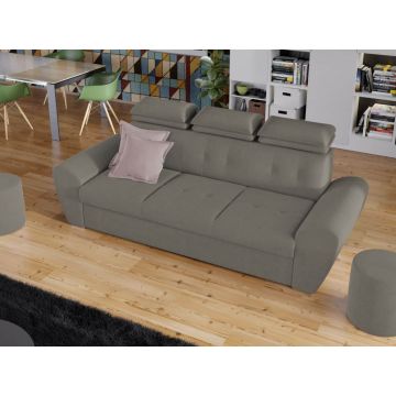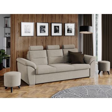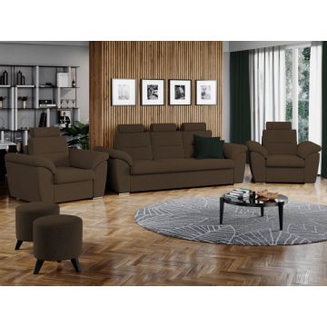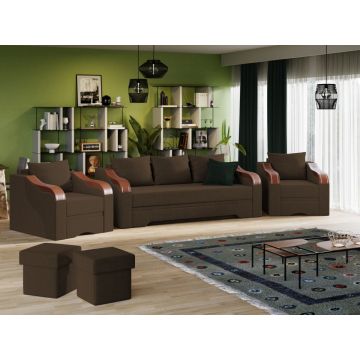 Canapea Santorini Maro Canapea Santorini Maro are un design modern, contemporan, cu un stil aparte. Picioarele sunt cu o forma usor arcuita si de culoare ivory. Se poate transforma intr-un pat confortabil in doar cateva minute si este prevazuta cu lada de depozitare . Ofera confort prin cele 3 perne detasabile, iar butonii de pe acestea si de pe brate dau un plus de eleganta si stil oricarui living. Este recomandata atat pentru incaperi mici sau mari si are dimensiunea de: 225 cm lungime, 105 cm latime, 90 cm inaltime totala . Dupa extindere, obtineti un spatiu pentru odihna si relaxare, cu suprafata utila 190 x 150 cm . Este tapitata cu o stofa de calitate uni pe diverse culori. Atentie: Pretul afisat nu include alte accesorii sau obiecte de decor. Taburetele, pernele deco si draperiile se pot achizitiona optional. Livrare gratuita si rapida, 4-10 zile lucratoare prin flota proprie Suntem producatori de tapiterii, fara intermediari Toate piesele de tapiterii au o garantie de 2 ani Sezutul si extensia canapelei sunt pe relaxa (arcuri elicoidale și poliuretan) . Lada incorporata este ideala pentru depozitarea lenjeriei sau a altor obiecte. Scheletul este rezistent, realizat pe structura solida de fag si pal. Extensia este de tip Doppelliege ce prezinta un sistem actionat prin role, astfel ca partea de sezut se trage si permite partii de spatar sa gliseze spre partea din fata si sa se pozitioneze orizontal. Canapea Santorini Maro se incadreaza cu usurinta in majoritatea locuintelor indiferent de stilul acestora. Puteti alege din mai multe culori pentru stofa. Produsele disponibile le puteti vedea aici Modele Santorini . Videoclipul poate contine alta nuanta decat cea de pe pagina produsului, acesta avand ca scop prezentarea familiei pentru a se reda in detaliu aspectul materialului. Dimensiuni Canapea Santorini Maro Lungime: 225 cm Latime: 105 cm Lungime intre brate: 190 cm Inaltime sezut: 49 cm Adancime sezut: 80 cm (fara perne) Adancime sezut: 60 cm (pana in perne) Inaltime cu perne: 90 cm Inaltime fara perne: 75 cm Dimensiuni extinsa Lungime extinsa: 190 cm Adancime extinsa: 150 cm Dimensiuni brate Inaltime brate: 69 cm Lungime brate: 96 cm Tapiterie Canapea Santorini Maro Tapiteria produsului este din stofa Maro . Nuanta acestui produs nu este pretentioasa, mascheaza eventualele evenimente neplacute prin care se poate murdari sau pata si se integreaza perfect in majoritatea locuintelor. Intretinere: se recomanda ca praful sa se stearga cu un material textil moale (finet) umed si sa nu se curete cu agenti chimici (diluant, acetona). Imaginile sunt cu titlu de prezentare si pot avea mici diferente de nuante in functie de display. Dimensiunile sunt exprimate în centimetri și pot oscila între ± 50 mm.