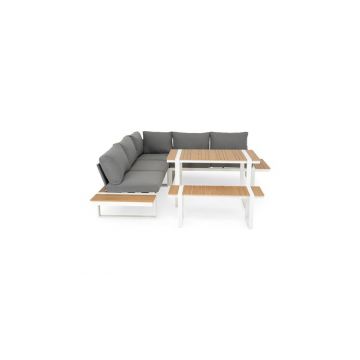 Realizat din structura solida de aluminiu vopsita in camp electrostatic. Include perne imbracata cu tesatura din poliester cu protectie impotriva umezelii si a razelor UV. Husele sunt prevazute cu fermoar pentru a fi mai usor de indepartat si curatat. Dimensiuni: Coltar: L.222/222 x l.76 x H.68 cm masuta/taburet 70*70*30cm